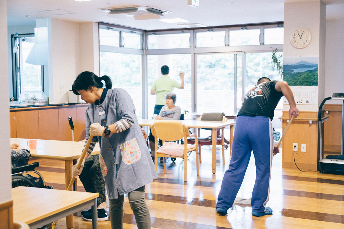- 就労及び生産活動の機会を提供し、併せて就労に必要な知識、能力の向上のために必要な訓練を行います。農作業(みかん・トマト・薬草等)・清掃作業・調理補助・工芸品作り(わら草履・しめ縄等)
