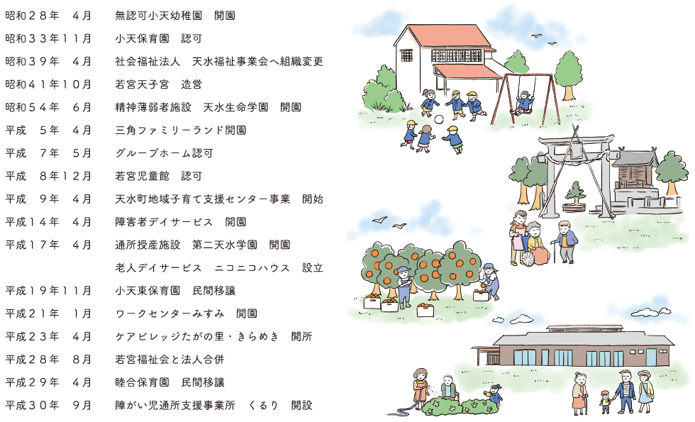 子ども、高齢者、障がい者、誰もが 地域の中で、地域とのつながりを保ちながら 安心して暮らせる仕組みづくりの推進と共に、 感謝の気持ち、慈しみの心、 そんな日本人として大切にしたい福祉の心を育むため 天水福祉事業会は活動を続けています。 これまでも、これからも。 次の、さらに次の世代へつながっていくことを願って。
